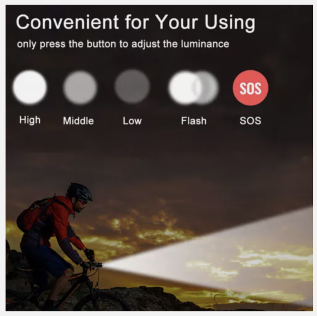 10. Modes: 5 (Super High>Middle>Low>Srtobe>SOS) slight press the button to change mode.