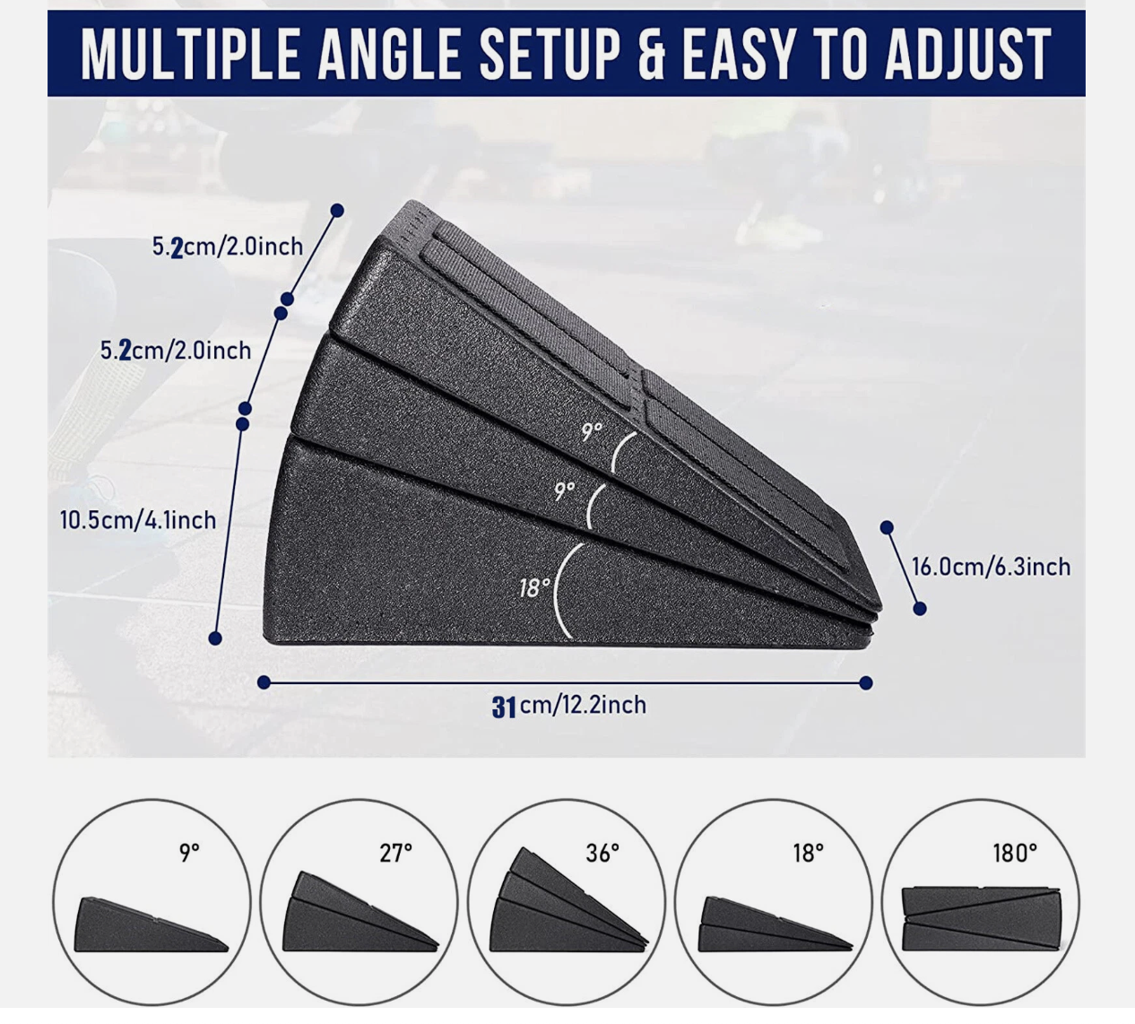 - 【Various Combinations for Use】-- The package comes with 3pcs slant boards with 2 sizes, respectively 9deg; and 18deg;. These three stretchers can be detached while providing five different angles for different defrees of stretching, respectively 9deg;, 18deg;, 27deg;, 36deg;,180deg;. You can use it alone or combine them to use, adding variety and challenge to your exercise program from easy to hard level.