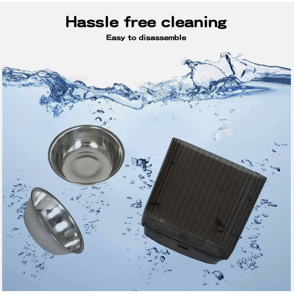 Clean the food bowls frequently. Clean the food hopper less frequently. You can take it off and wash it in the sink. Just make sure it is dry before you put it back on.