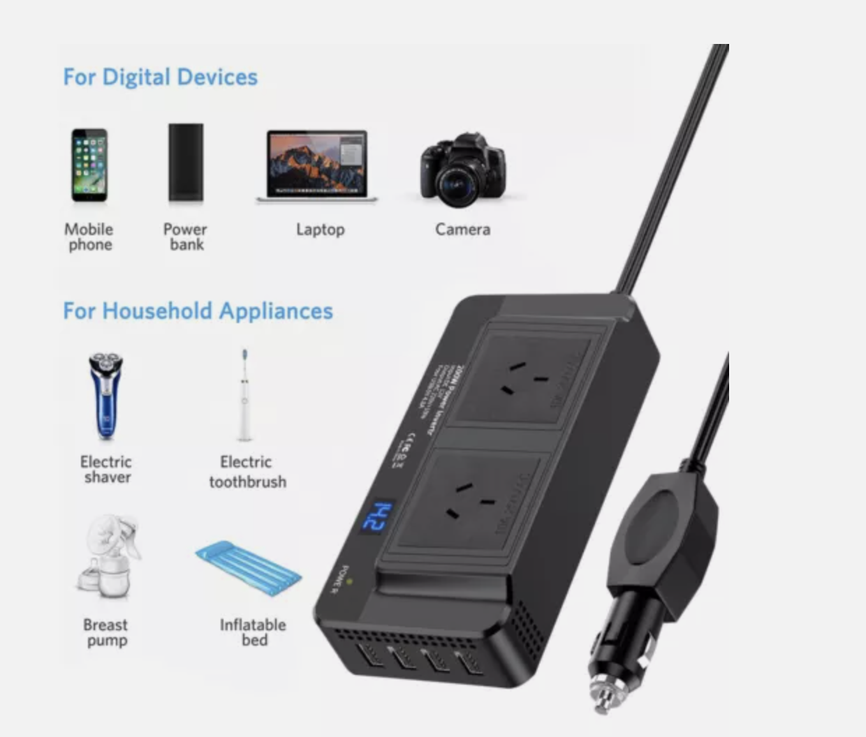 - This inverter can be converted into 240V AC voltage through the 12V DC voltage output by the car cigarette lighter, which can be used to power laptops, LED lights, cameras, etc