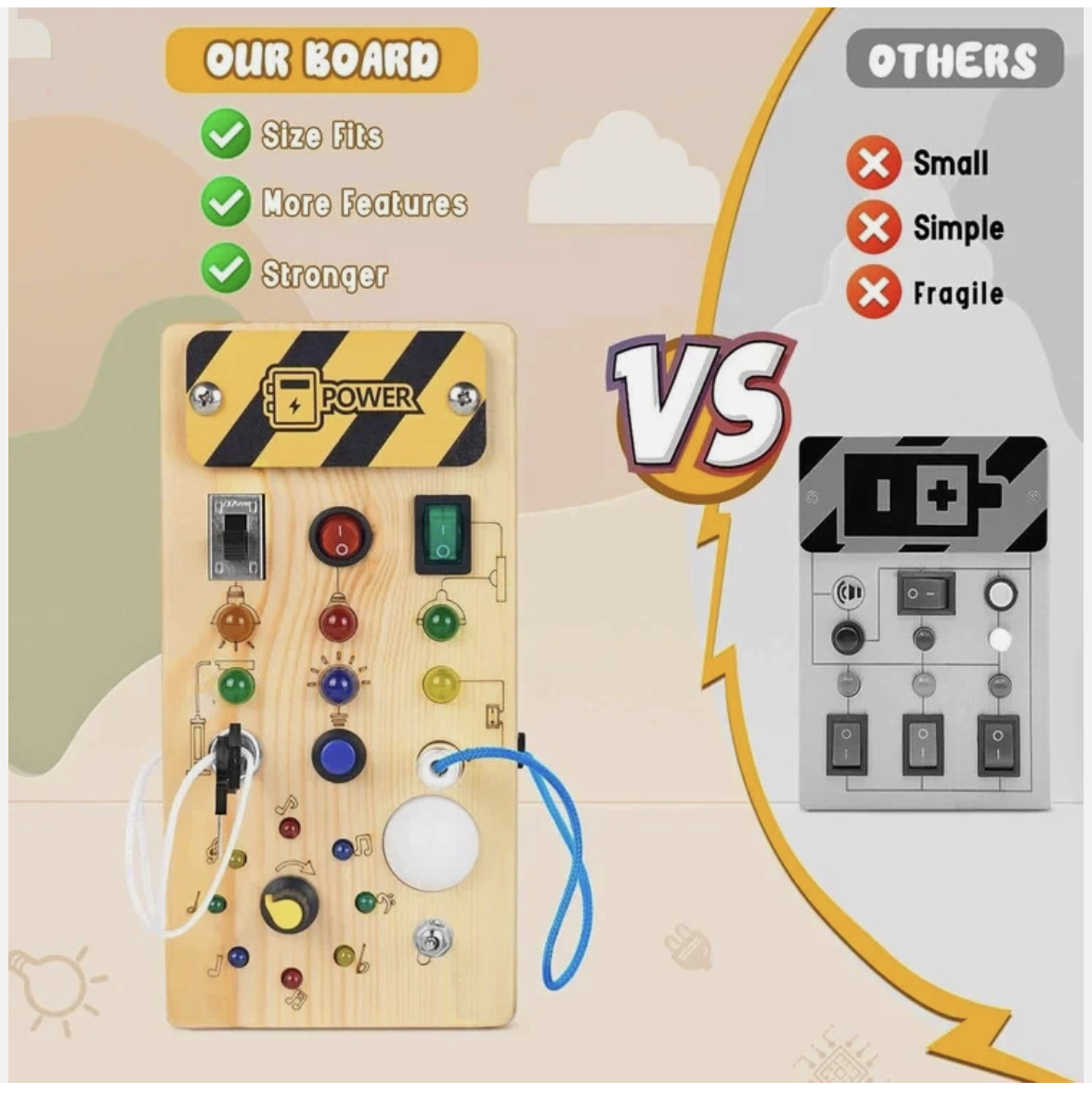 - Montessori Busy Board for Preschool Children: The busy board is equipped with switches of varying complexity, including light bulbs that correspond to the switches. This sensory board can provide children with hours of entertainment. Two AAA batteries are required (batteries not included).