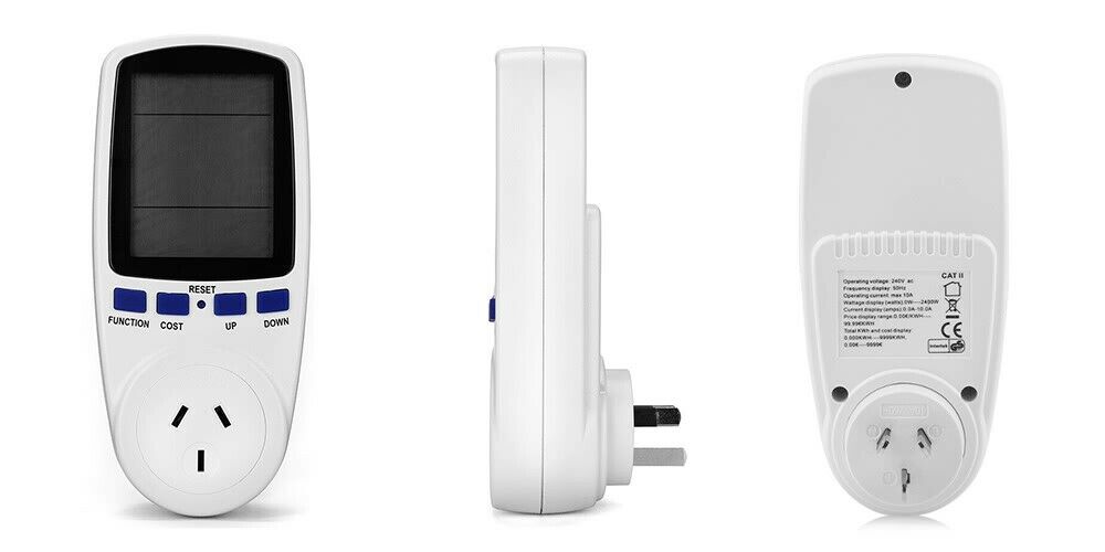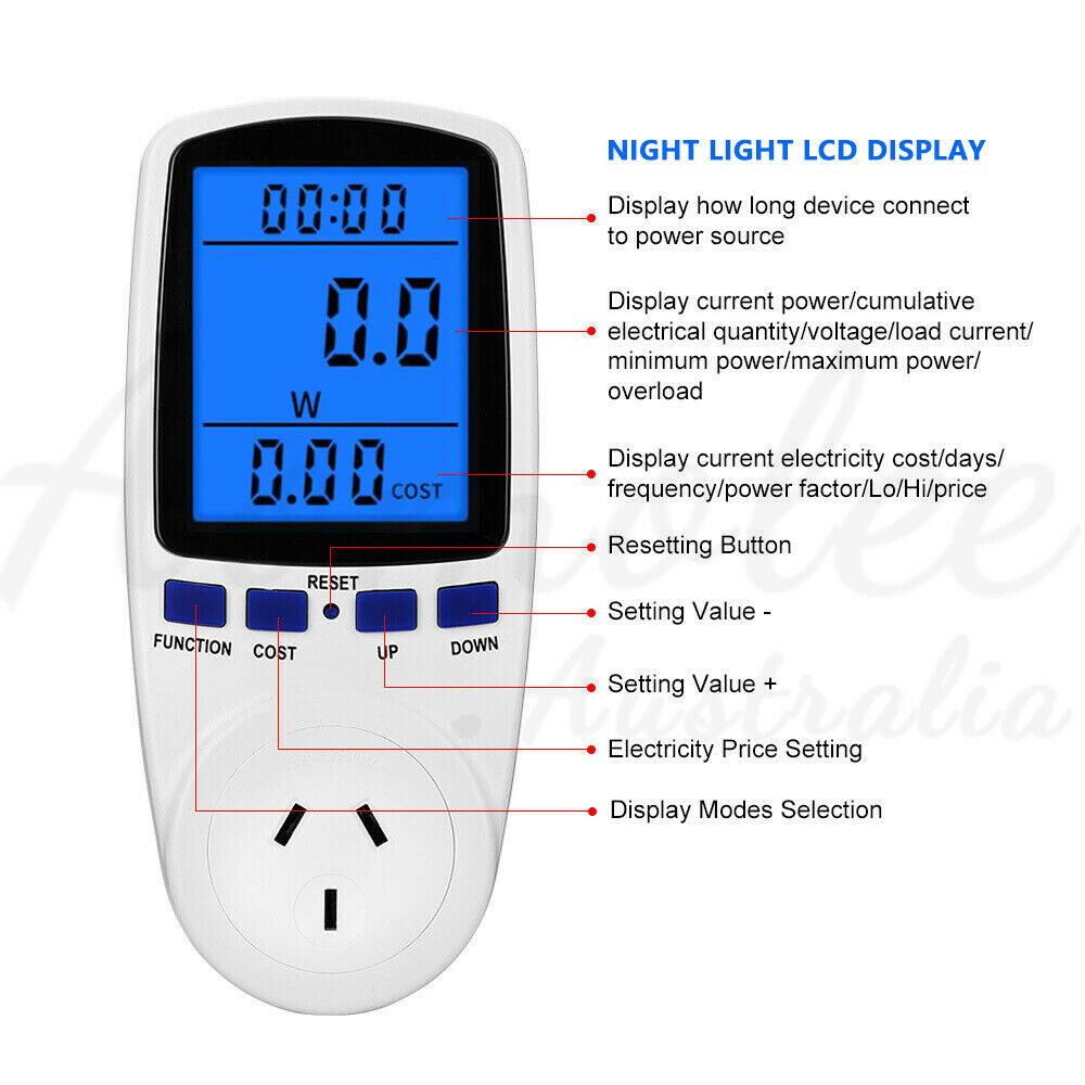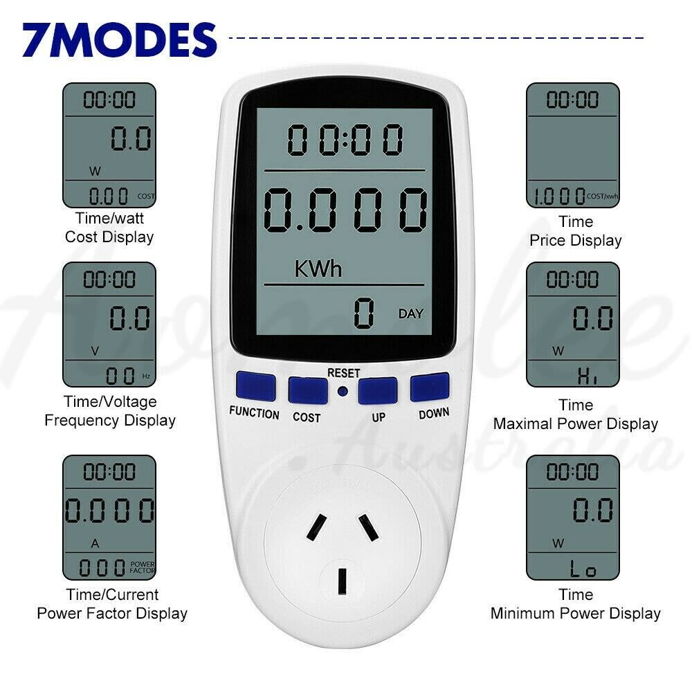 - Measures various parameters: power (W), energy (kWh), volts, amps, hertz, power factor and maximum power (W), time, days - kWh is vital as this is what your electricity bills are based on!