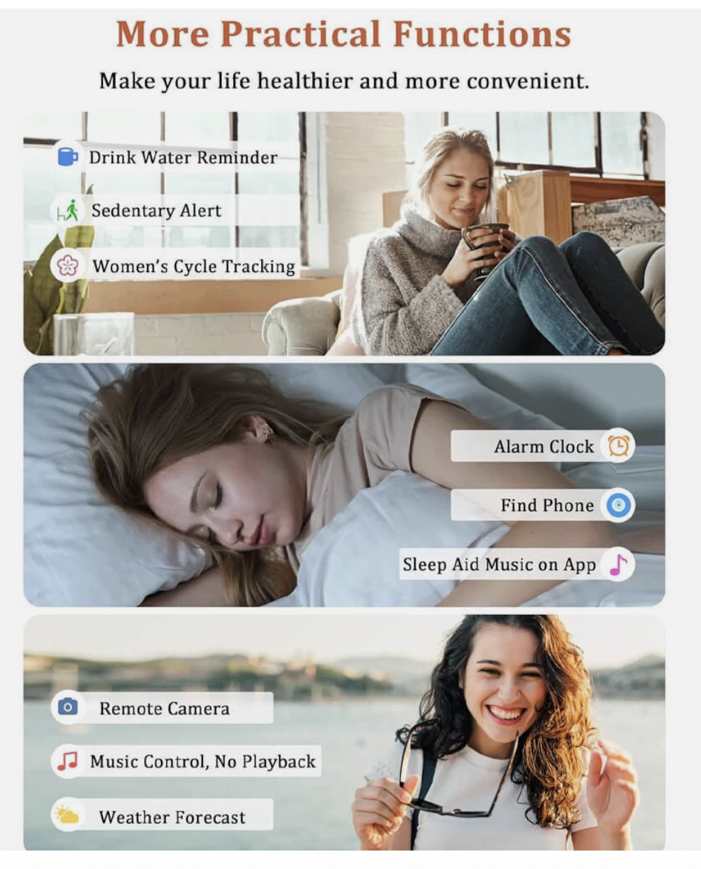 【Multifunctional & Smart Assistant】This smart watch for iphone compatible has many daily practical functions, such as weather forecasts, music control, , camera control, smart alarm clock timer, find phone, sedentary reminder and others.